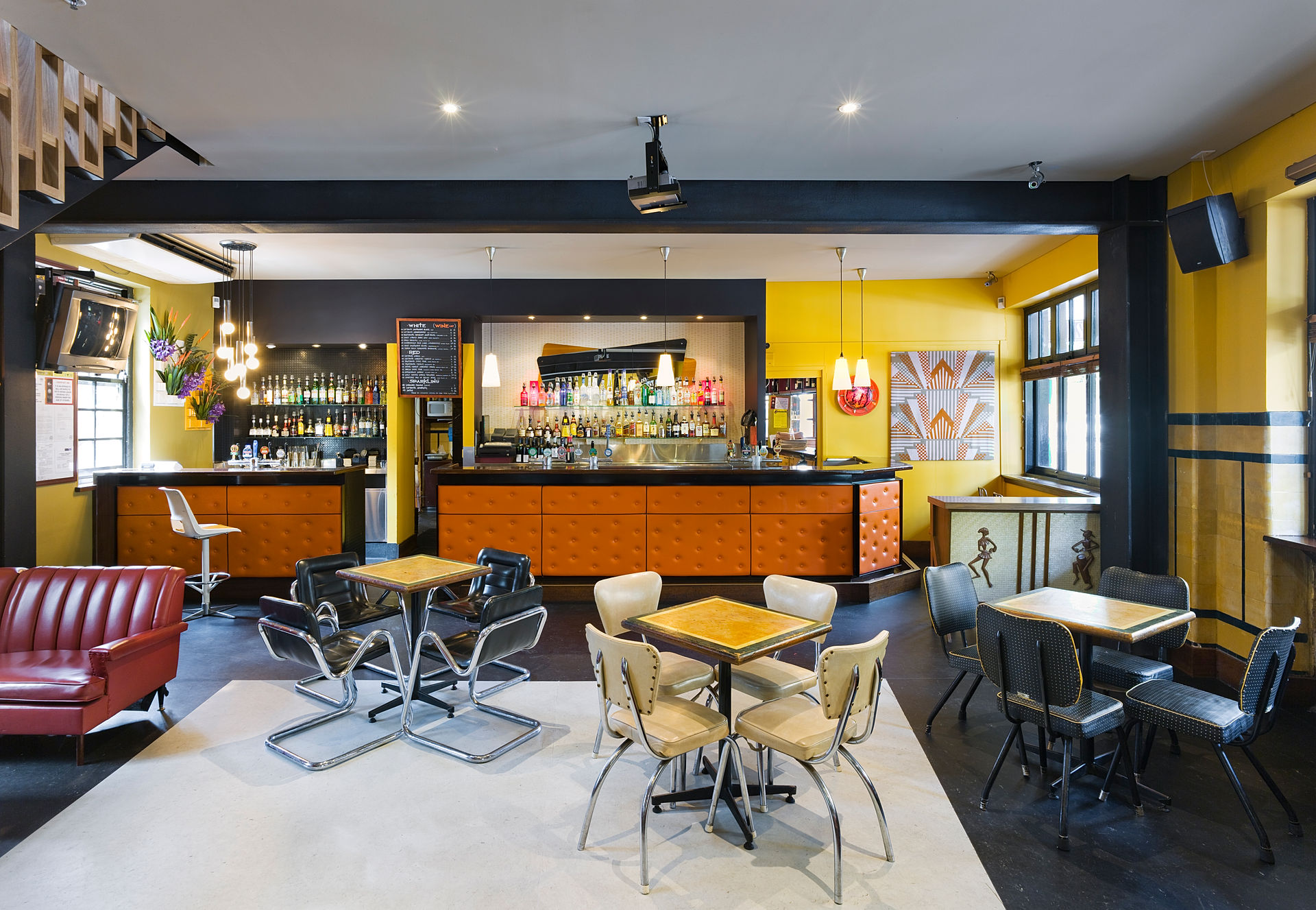 Inserted into the upper floors of the Royal Sovereign Hotel, this 1st floor courtyard and bar is a garden oasis within the dense inner city suburb of Darlinghurst Sydney. The space was designed to complement the strong 1960s decor of the much loved ground floor ‘Darlo’ Bar. Cut two storeys into the existing building, the courtyard space is hidden from the outside, using the deep set location to attenuate sounds. Perforated aluminium panels line the courtyard walls in colours which suggest a garden in the late afternoon sun. A collection of quirky, 1960s garden furniture, in white, splashed with bright fabrics brings the backyard into the city. The internal bar space mixes timber screens, orange tones and unusual bird shaped pendant lights to link the courtyard with the living room quality of the ground floor bar.